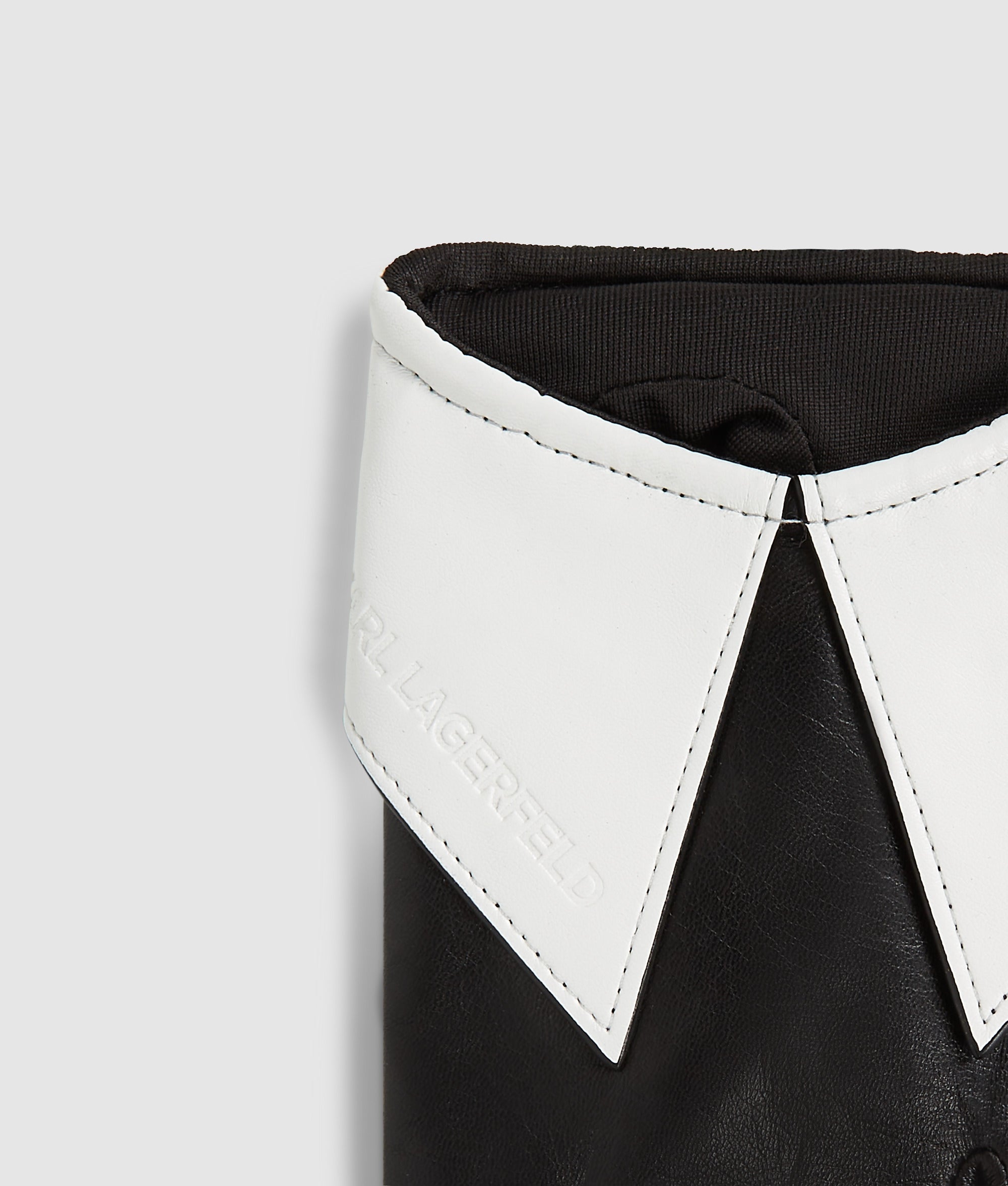Playful collar detailing in homage to Karl Lagerfeld’s signature style defines these fingerless gloves. Embellished with tonal branding. they add a unique touch to any outfit.