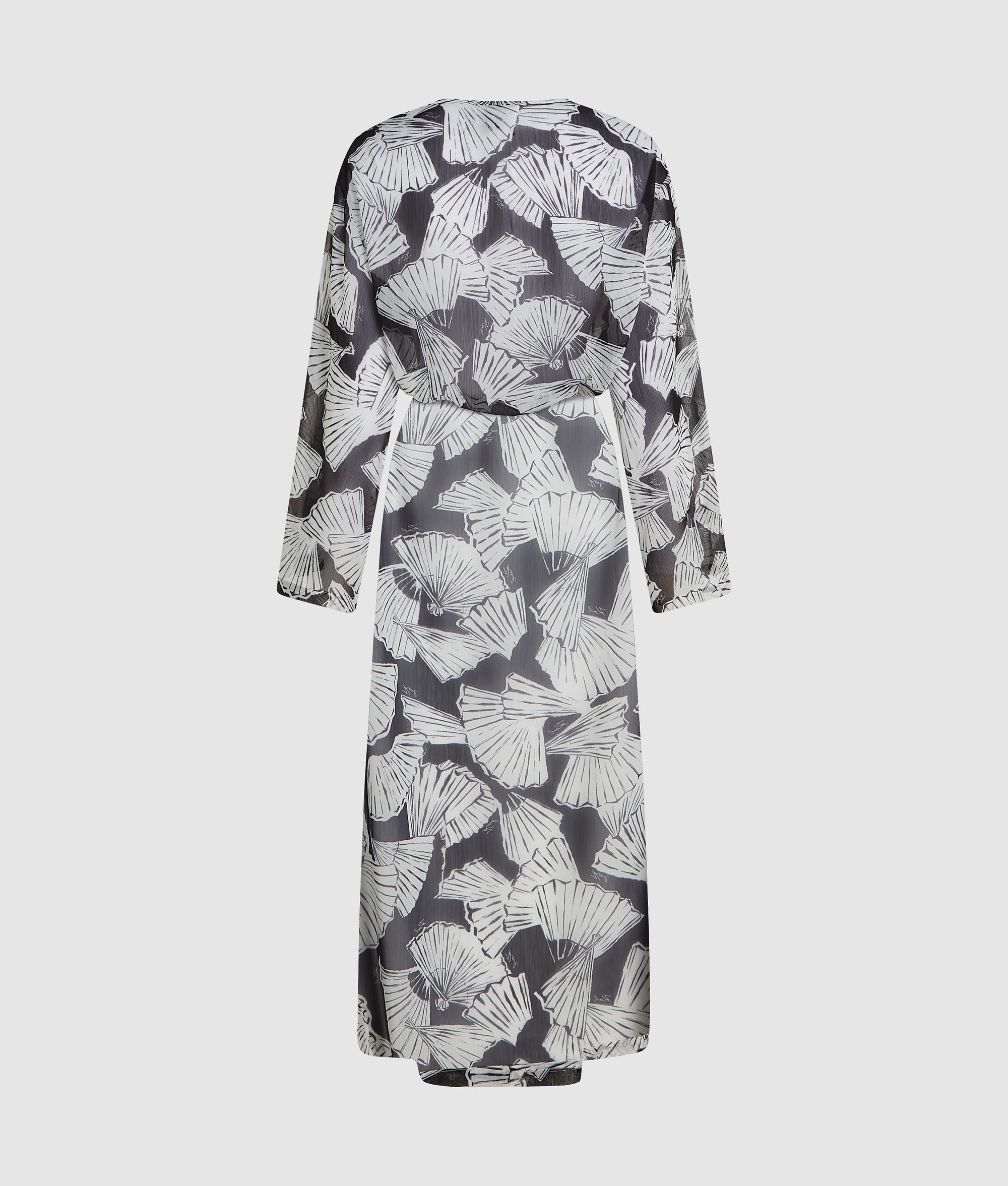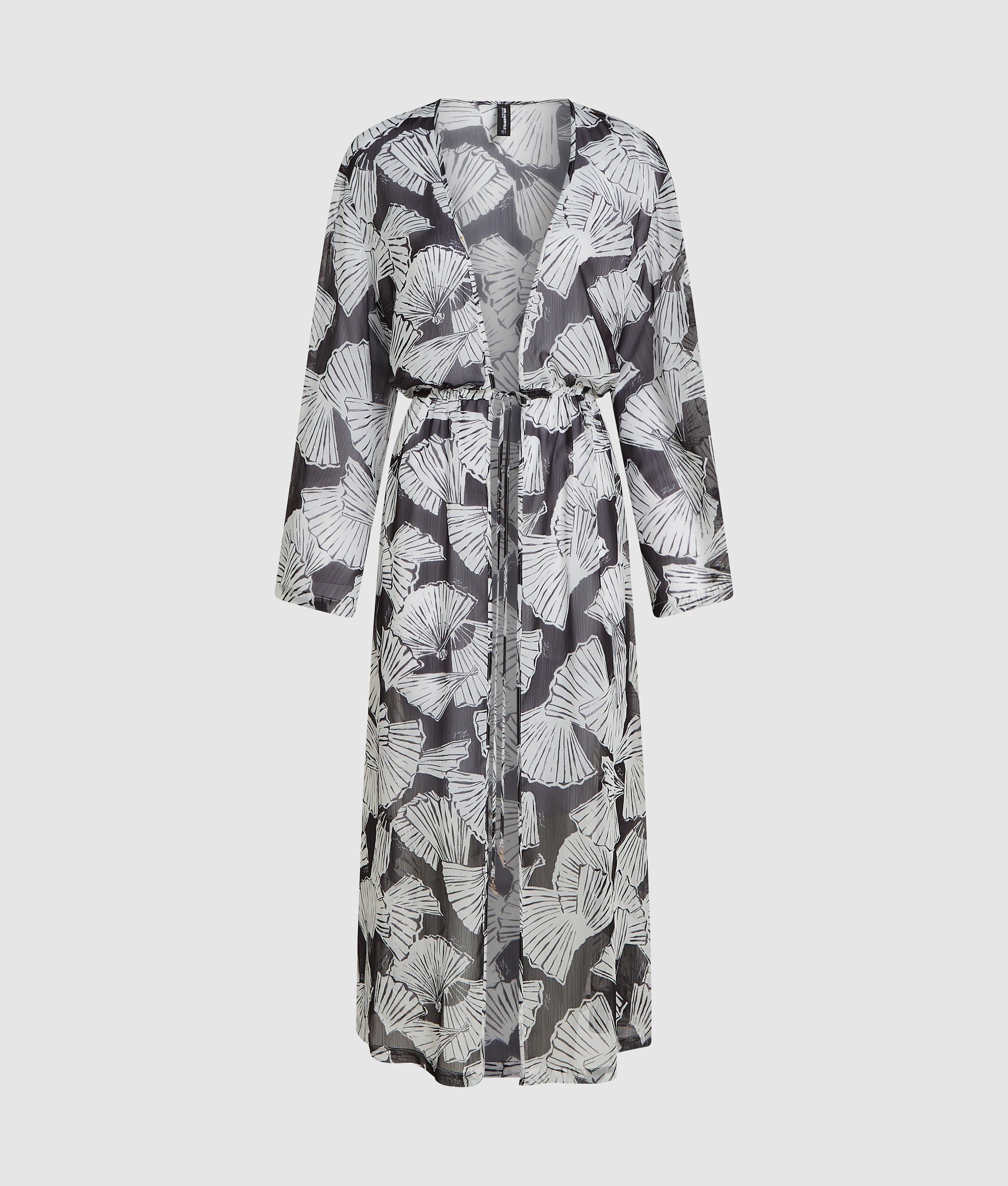 Flowing in a maxi-length silhouette. this kaftan wraps you in lightweight comfort. Waist ties. finished with Signature logo charms. add definition. while the elegant fan print makes an eye-catching statement.