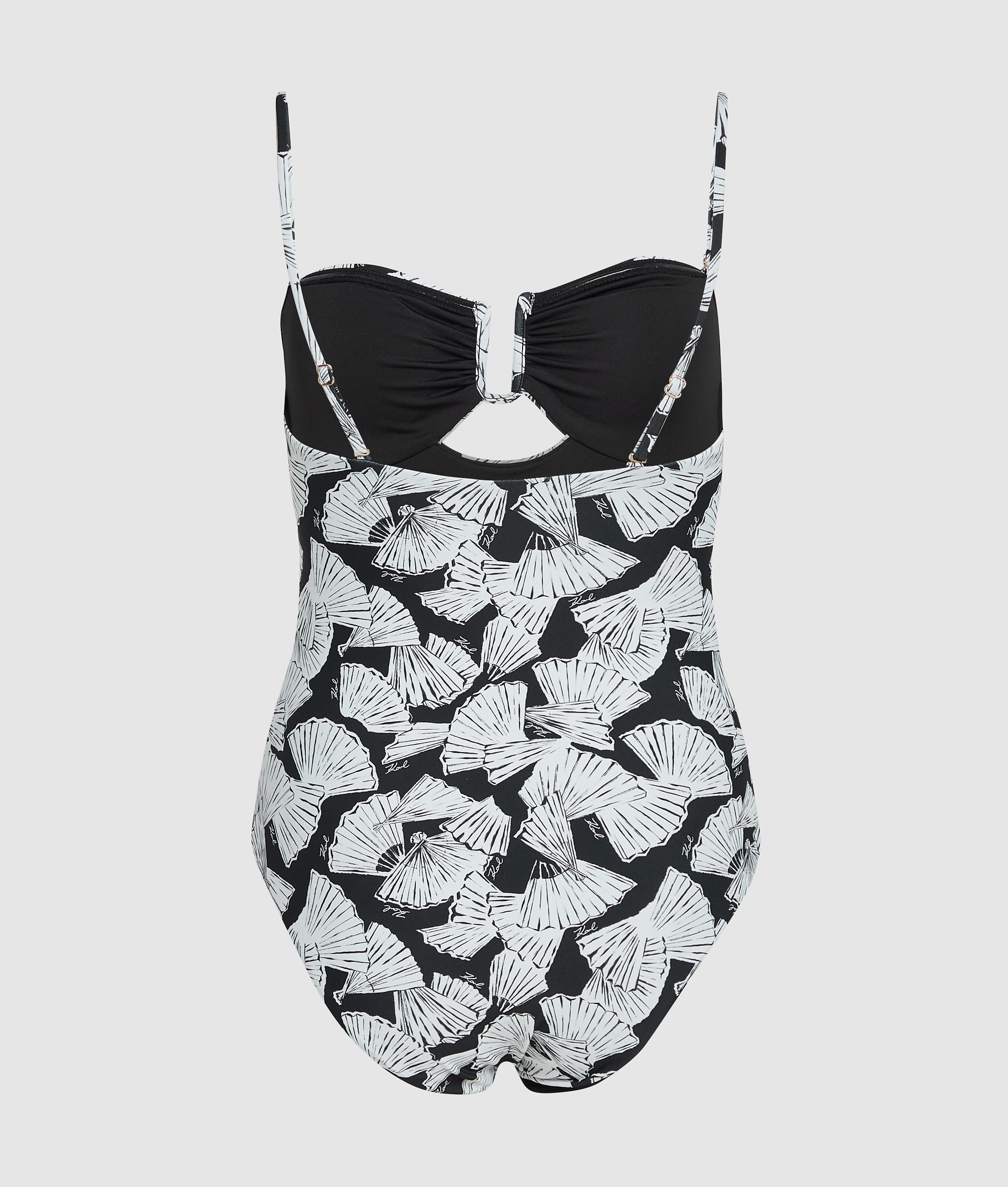 Elegance meets statement style in this fan-print swimsuit. Adjustable straps and removable padding shape your silhouette. while a cut-out detail adds refined allure.