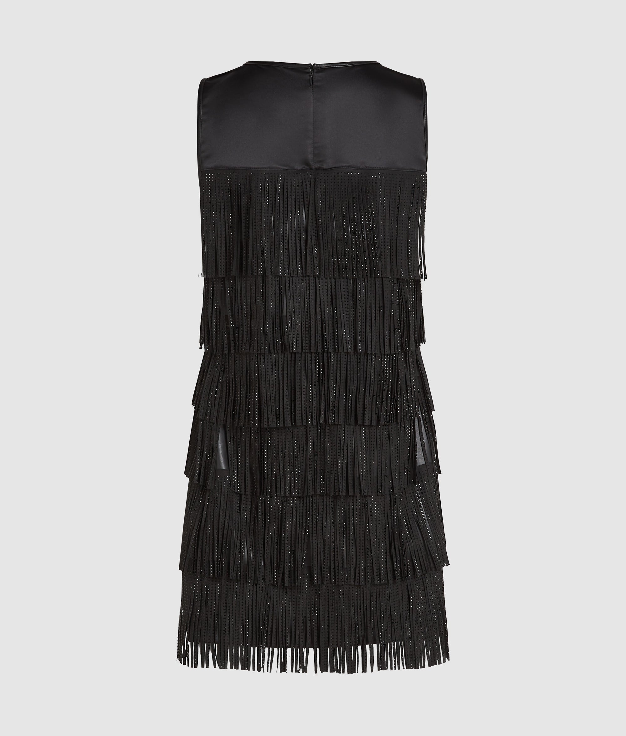 Satin panels meet playful faux-leather fringe in this sleeveless dress that moves with look-at-me attitude.