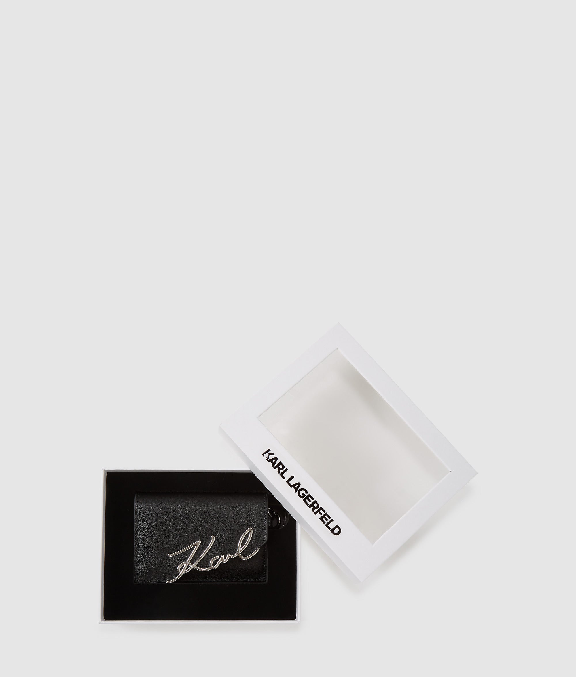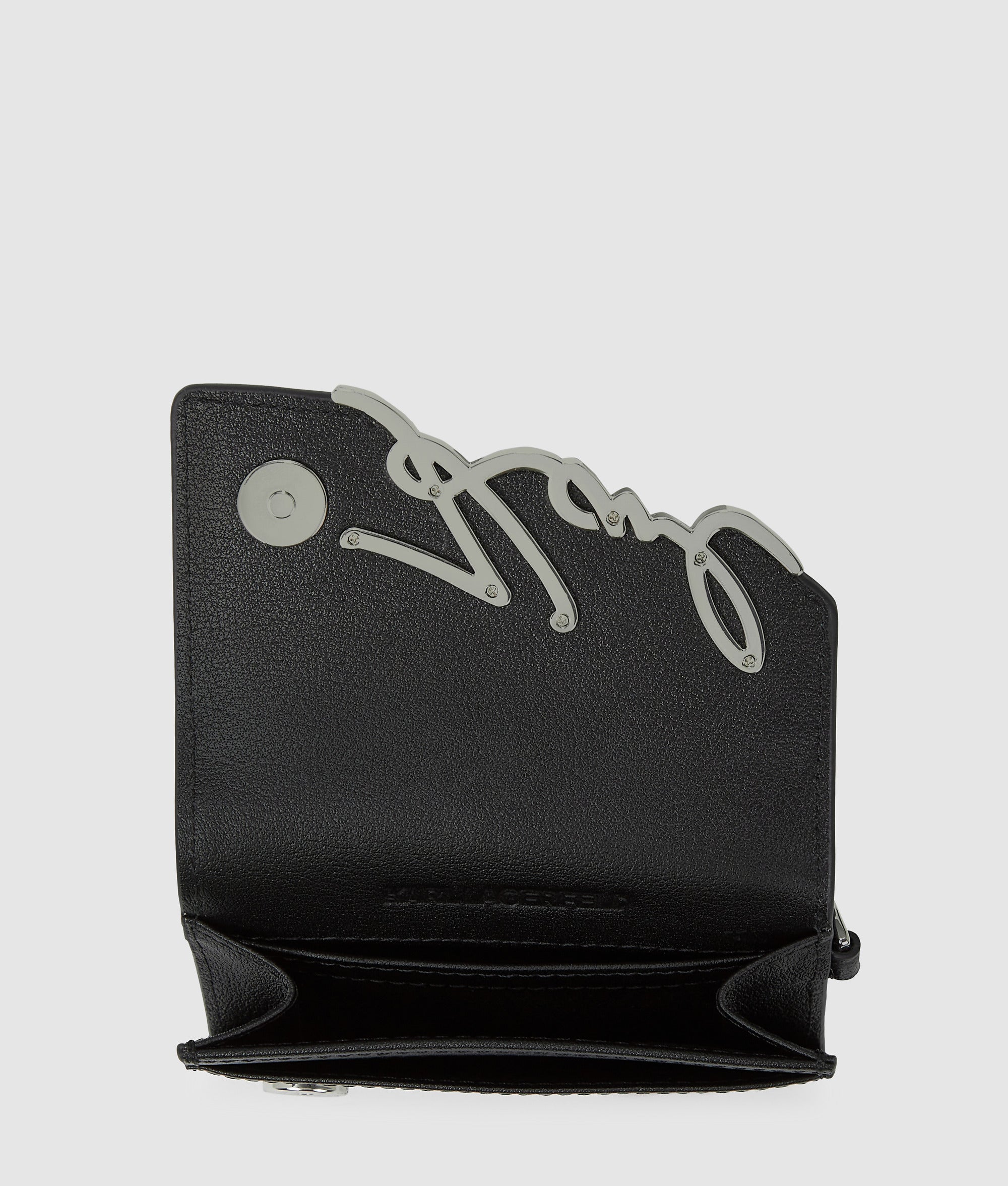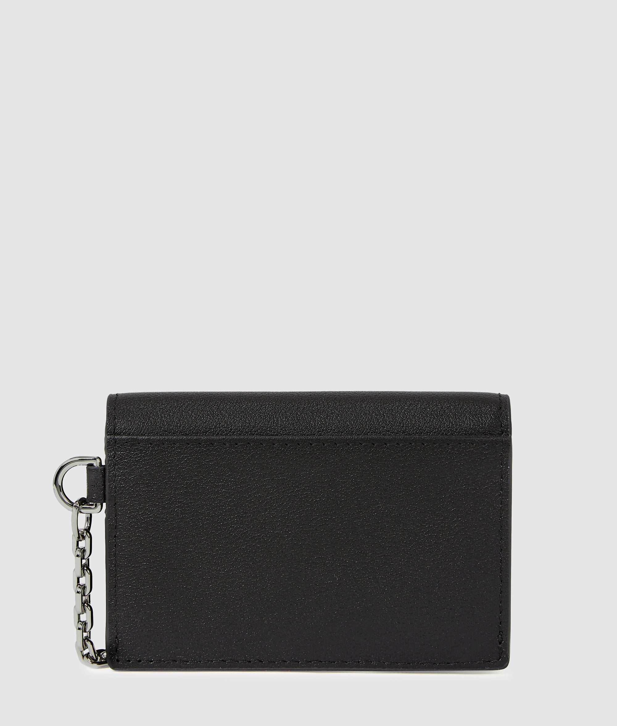 A sleek leather cardholder with bold Signature hardware and a chain clip. designed for essential organization.
