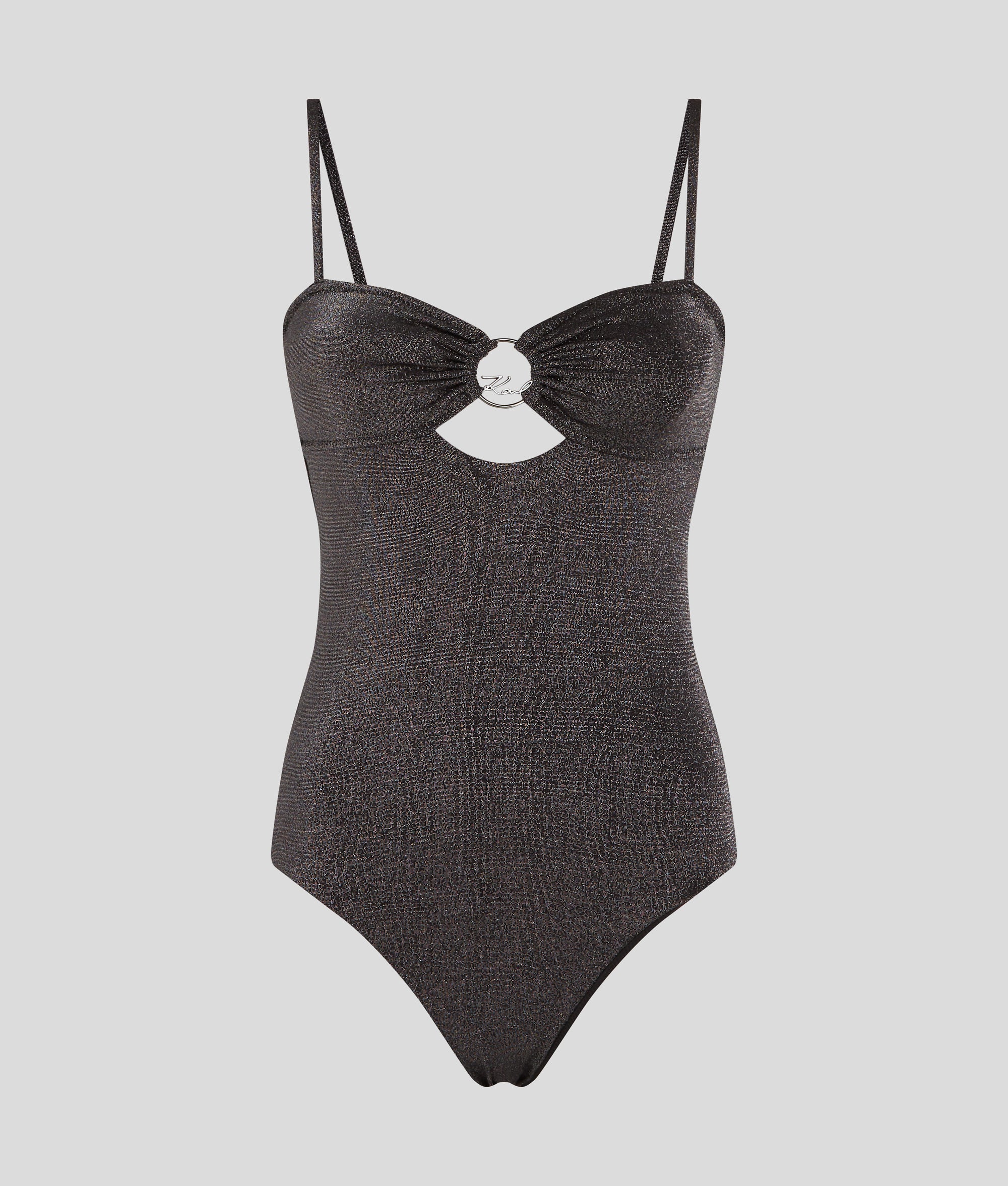 Demand attention in this light-reflecting swimsuit with a classic bandeau-style silhouette. Adjustable straps and removable padding offer a customizable fit. while the KARL Signature ring detail adds a statement touch.