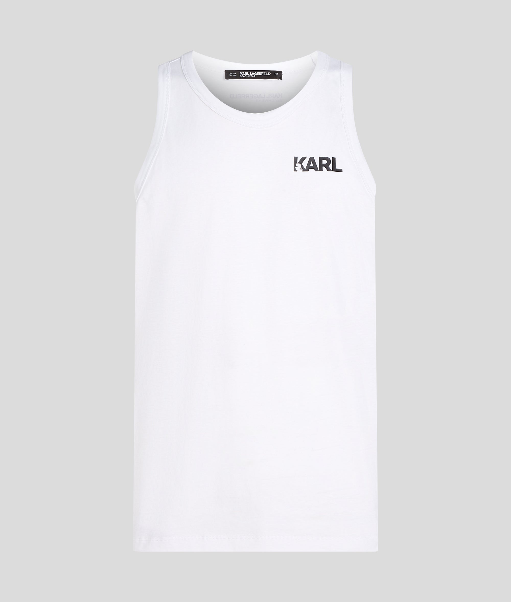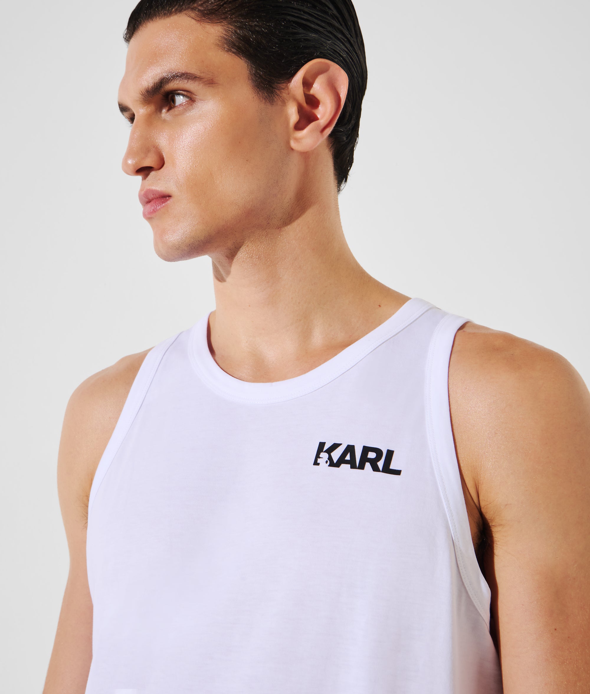 An ultra-lightweight beach tank top featuring a comfortable sleeveless design and a classic crew neck. The prominent KARL logo at the chest adds a statement touch. perfect for sunny days by the water.