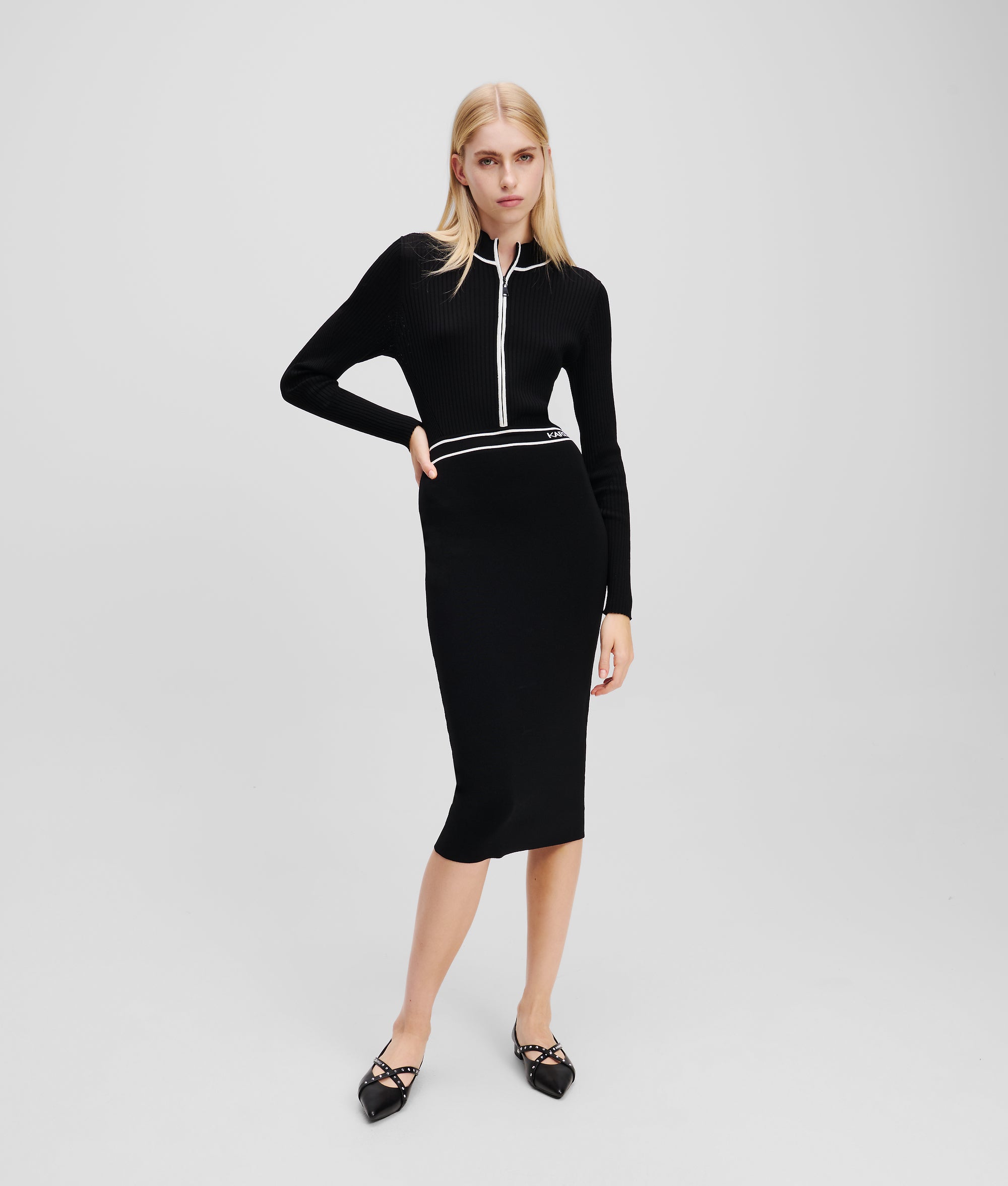 This midi dress features an ultra-sleek silhouette and a sophisticated mock neck. A striking zip-front closure enhances its modern appeal. while logo tape at the waist adds a statement touch.