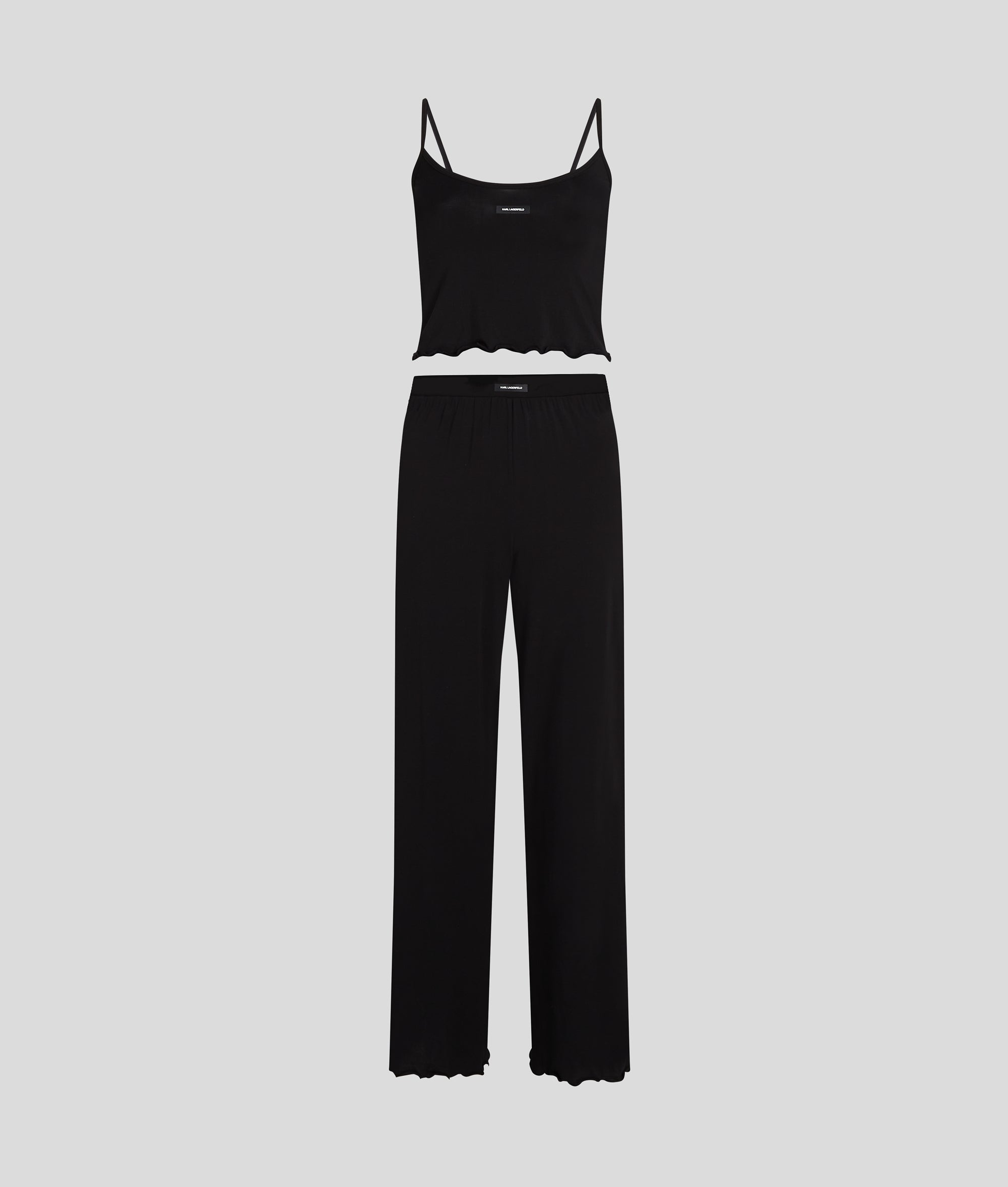 Unwind in luxurious comfort with this two-piece pajama set. featuring a chic camisole top adorned with adjustable crossover straps. The matching pants offer an elasticated waist for a relaxed fit. while a subtle logo detail adds a touch of elegance.