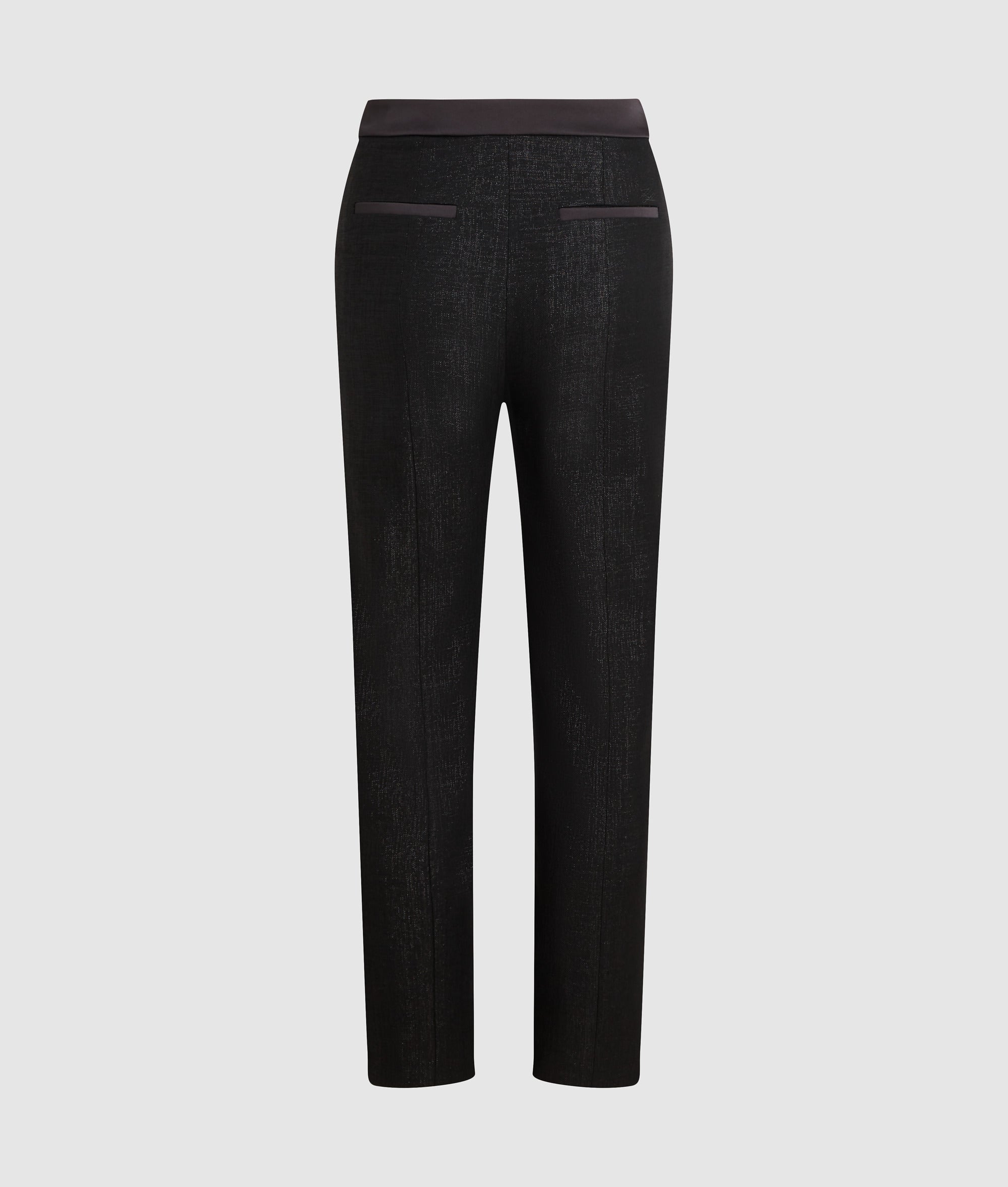 These metallic pants shimmer with a sparkling fabric. adding a bold touch to tailored looks. The satin waistband and back pockets elevate their sleek silhouette.