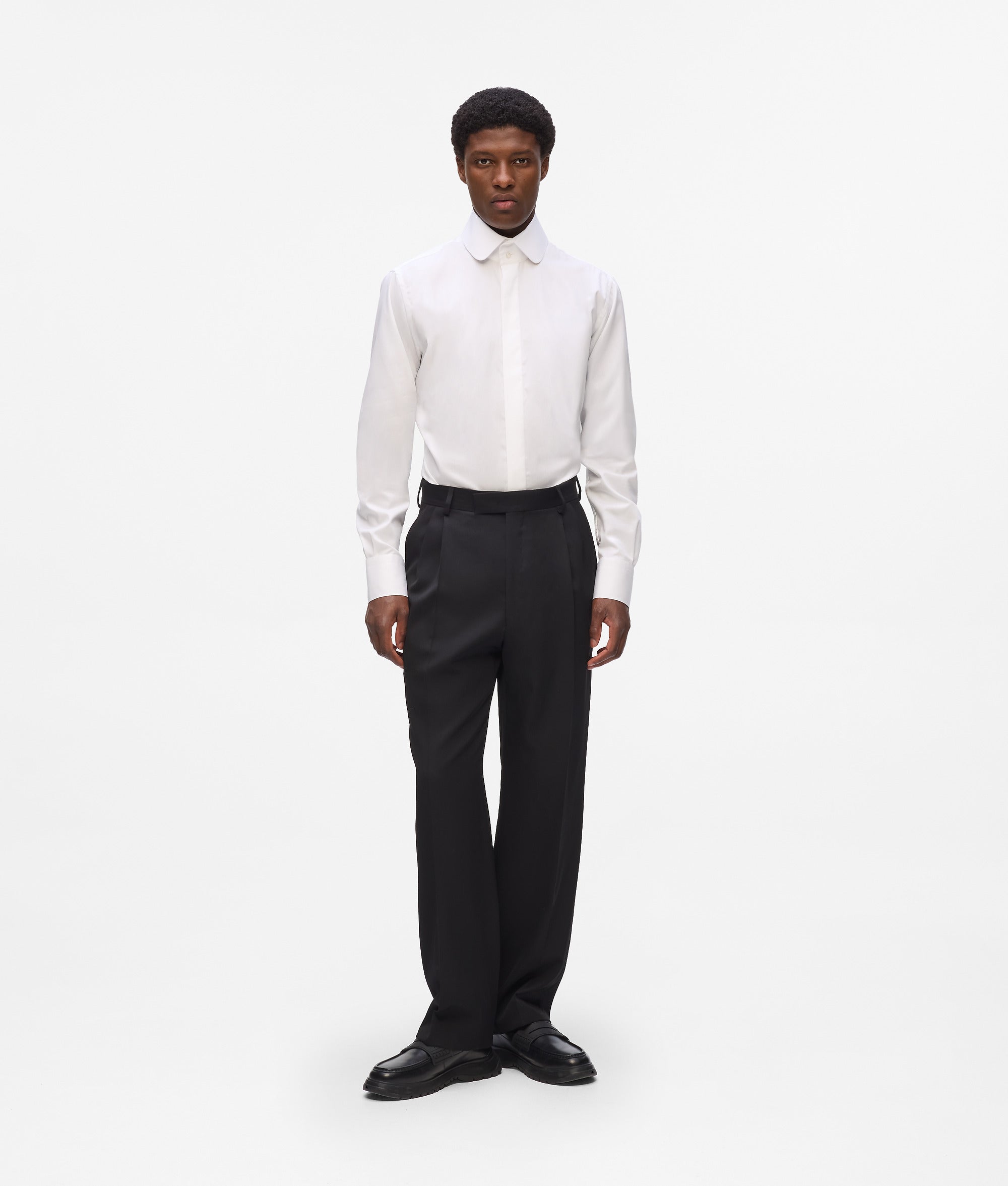 A woven shirt with a modern rounded collar and deep cuffs. subtly elevated by a discreet logo detail and a clean. concealed button front.