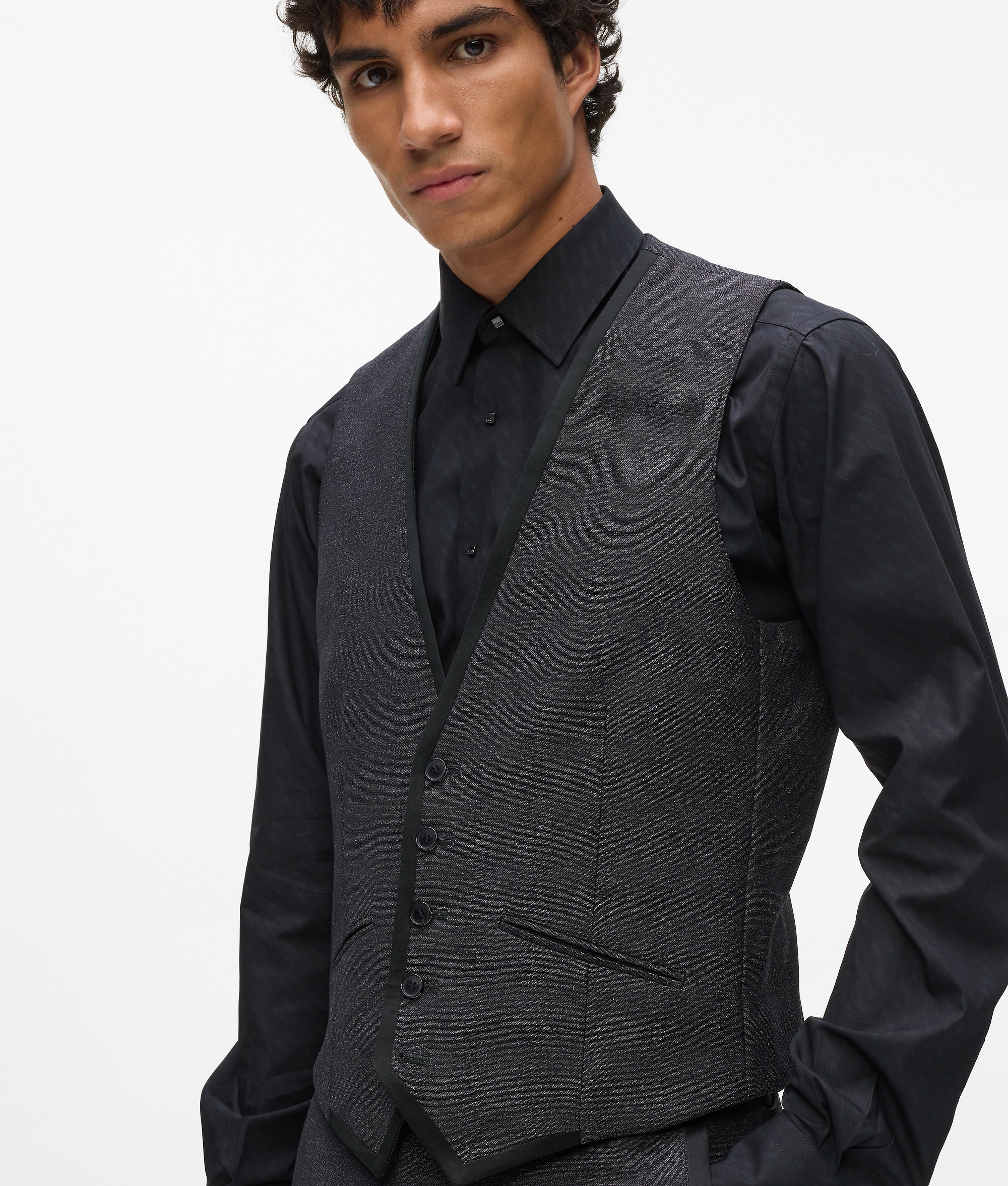 Sleek tailoring defines this waistcoat. Layer it under the matching blazer and pants for refined modern elegance.