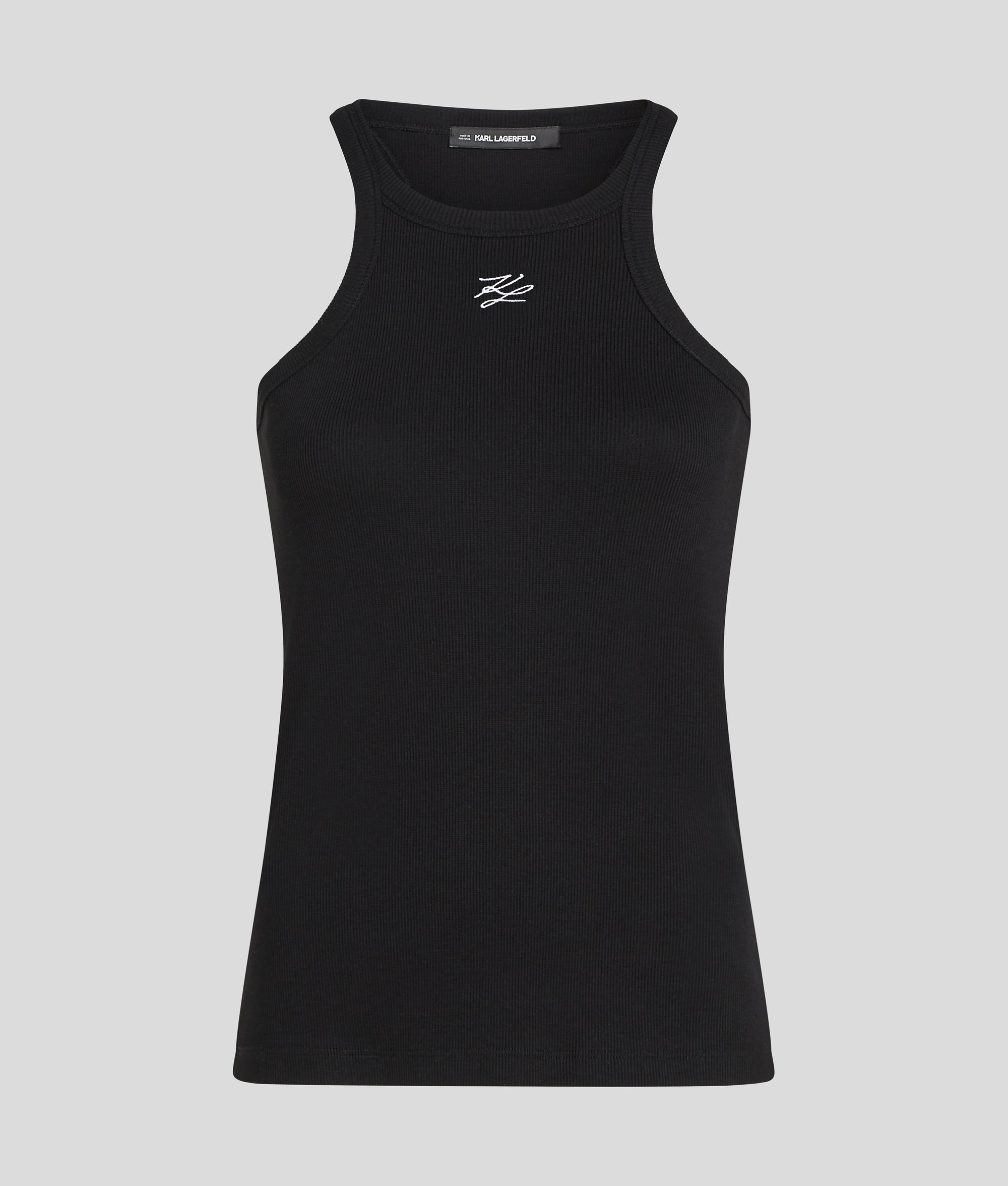 A sleek. figure-hugging silhouette defines this sleeveless racer tank top. featuring KARL Autograph embroidery at the chest. Perfect for effortless layering or standalone style.
