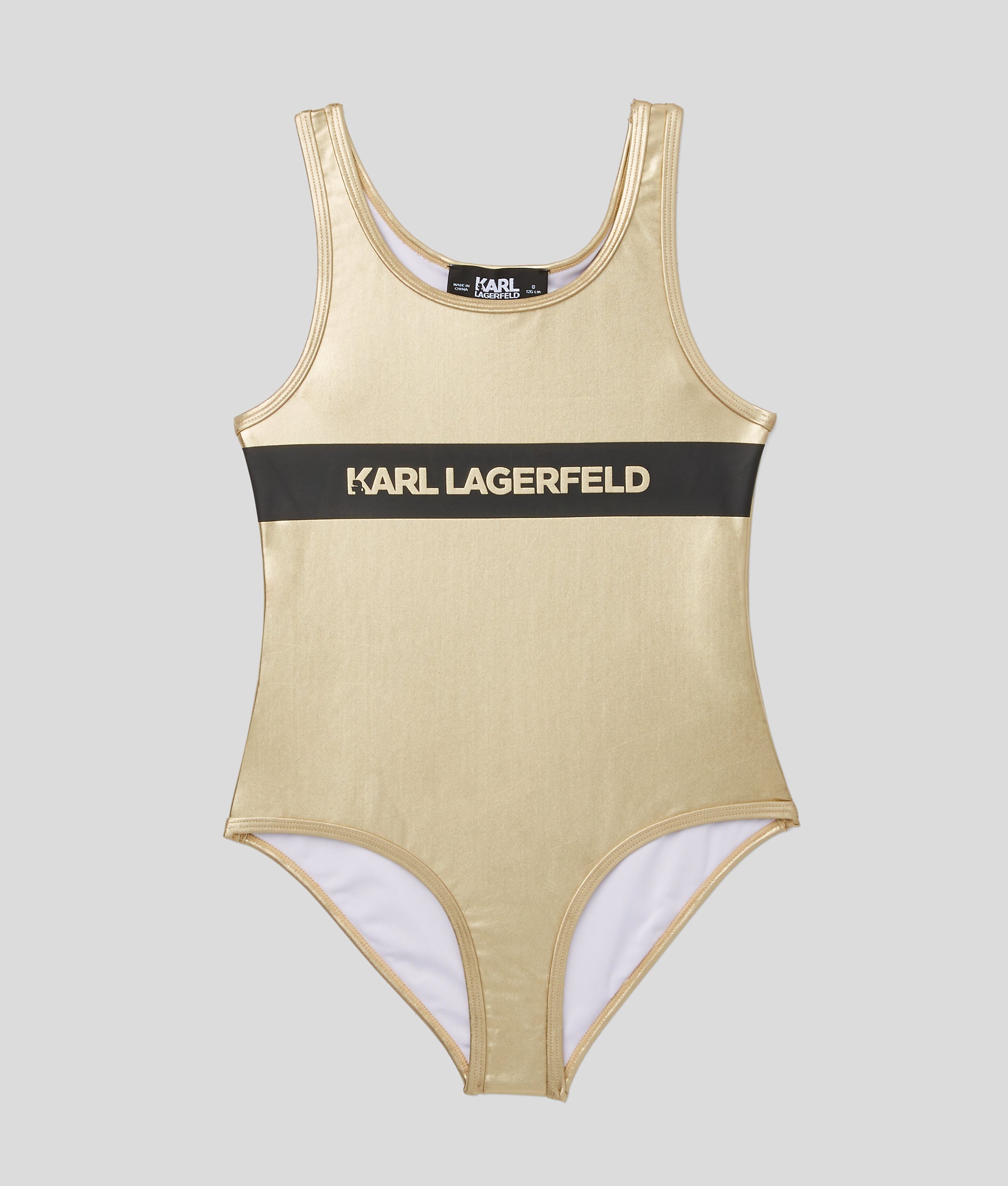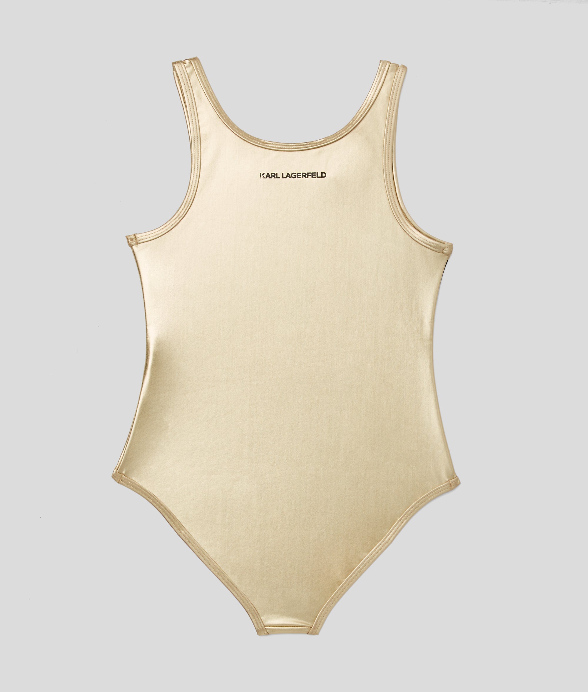This vibrant swimsuit is a must-have for summer adventures. The one-piece silhouette features a scoop neck and back. and a striking KARL LAGERFELD-branded band at the chest.