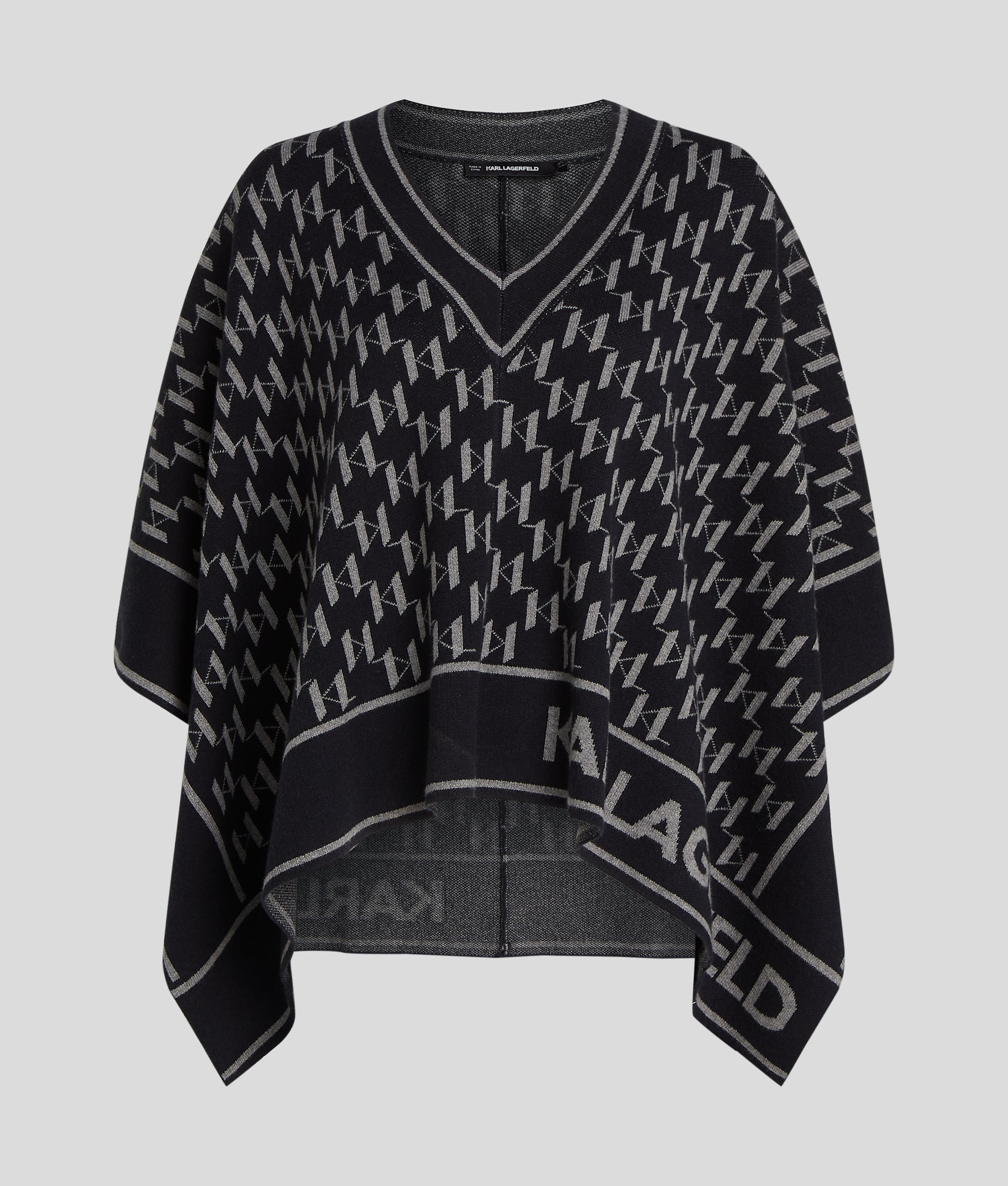 This cozy knitted cape features a V-neckline and a striking all-over KARL Monogram design. Bold KARL LAGERFELD detailing at the hem adds a statement touch.