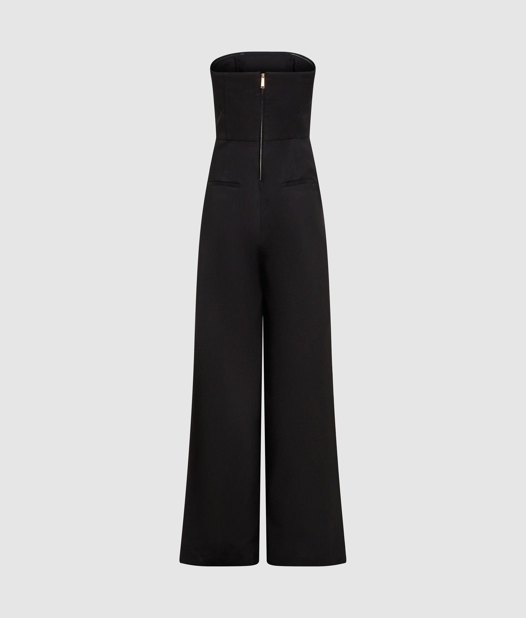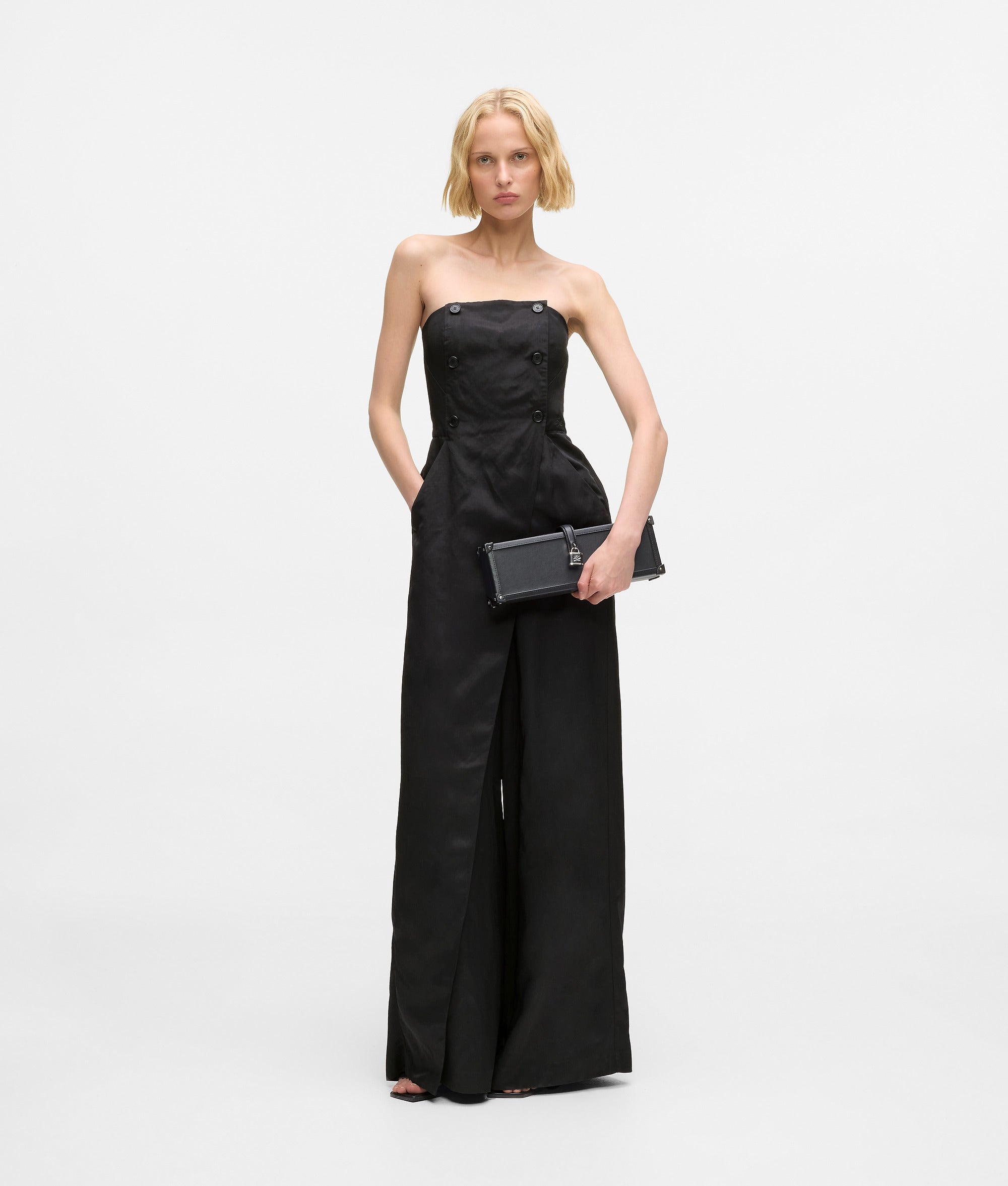 This tailored jumpsuit frames the figure with precision: a fitted bodice. wide-leg pants. and an asymmetric crossover front punctuated by double-breasted buttons. Detachable straps add versatility.